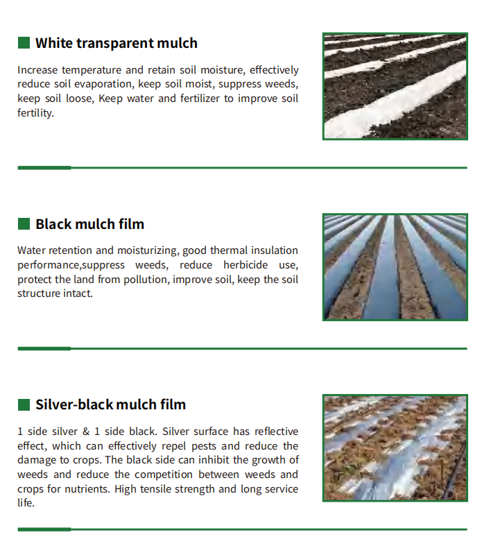 Increase temperature and retain soil moisture, effectively reduce soil evaporation, keep soil moist, suppress weeds,